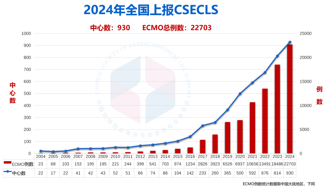 中国医师协会体外生命支持专业委员会公布的2024年中国体外生命支持发展数据显示,全国ECMO实施总例数达22,703例,同比增长22.8%,呈现持续快速增长趋势。